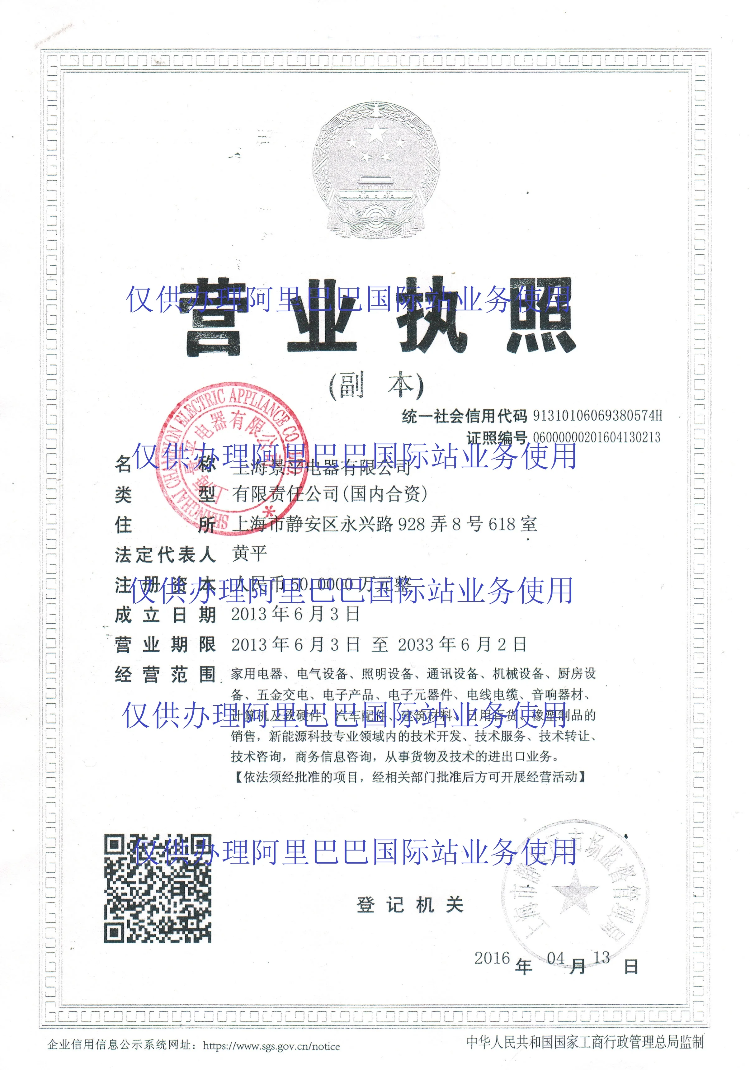 Registered address : Room 618, No. 8, Lane 928, Yongxing Road Shanghai China